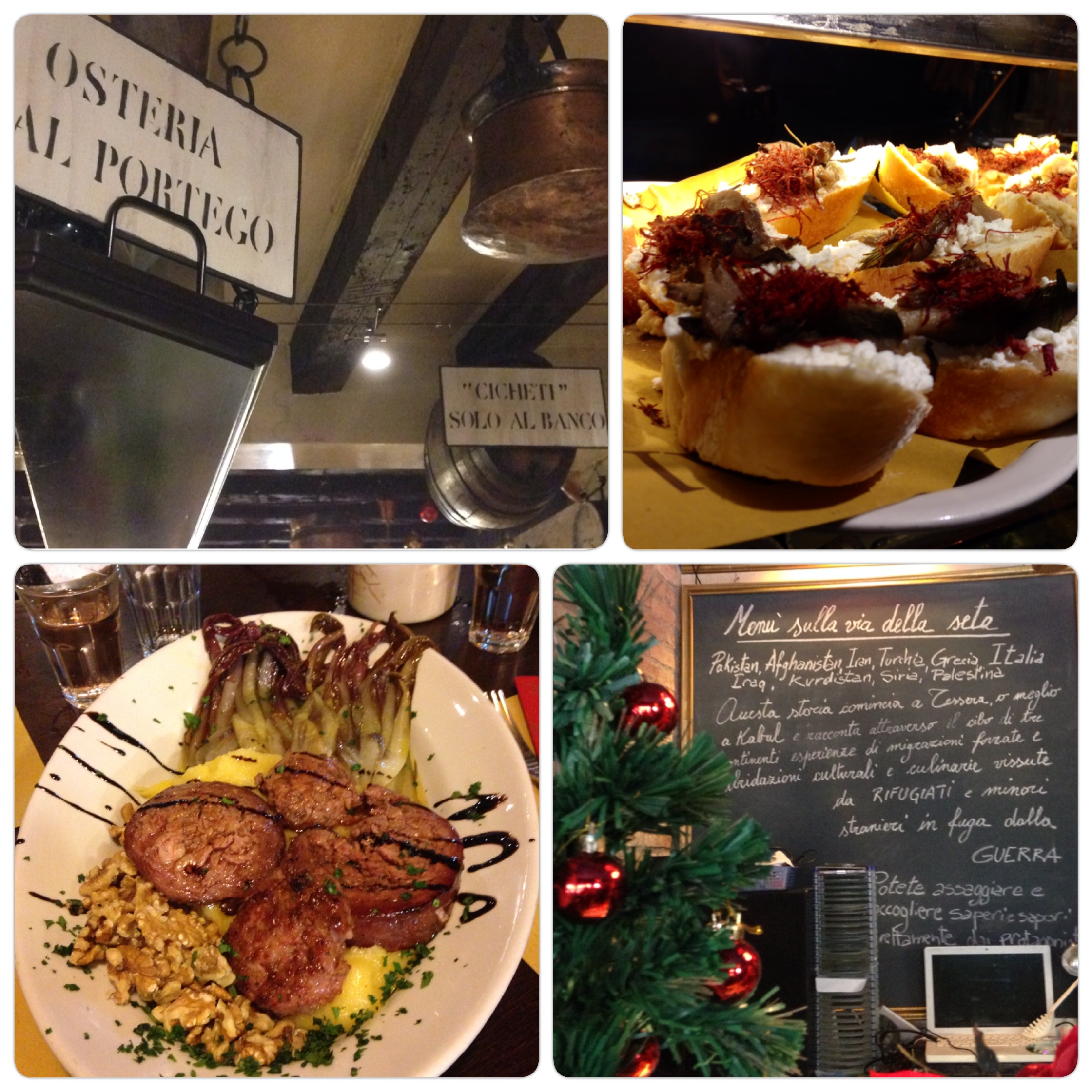 Che fa uno a Venezia quando gli vien fame? Va in un bacaro, ordina un’ombra e la accompagna con un paio di cicheti. Il mio fidato dizionario etimologico (aka Wikipedia) propone le seguenti spiegazioni per queste bellissime parole del dialetto veneziano: bàcaro, l’osteria/enoteca, deriva da Bacco, dio del vino, o dal detto “far bacara” ovvero “festeggiare”; bacari erano anche i vignaioli che vendevano il loro vino in Piazza San Marco, in bicchieri che venivano chiamati ombre perché, per proteggerli dal sole, i venditori spostavano i barili lungo il tragitto segnato dall’ombra del campanile. Cicchetto invece viene da “ciccus”, piccola quantità in latino, e rivela l’antica storia di questi stuzzichini che accompagnano le bevute. I cicheti vengono venduti al pezzo, come le tapas spagnole, e volendo ci si può fare un pranzo intero. Più spesso, però, se ne scelgono un paio, giusto per non bere a stomaco vuoto – anche se al quarto spritz le certezze vacillano… Infatti noi dopo i primi due ciccheti al baccalà mantecato al Bottegon (già Schiavi) di San Trovaso – che ci hanno, come si suol dire, aperto la voragine – ci siam fatti un panino con la soppressa e uno con la porchetta. Dio benedica la soppressa, che ha segnato il nostro weekend veneziano: menzione d’onore a quella cotta nell’aceto con radicchio marinato, polenta e noci che abbiamo mangiato sabato sera Al Portego (ottima osteria con ottima selezione musicale!). La domenica, invece, Marialisa ci ha portato a mangiare in Campo Santa Margherita, in un piccolo ristorante take away che si chiama Orient Experience – altrimenti conosciuto come “l’afghano”. Venezia porta d’Oriente e tradizione di accoglienza, popoli e culture che si sedimentano l’uno sull’altro, la carne saporita dell’agnello, i ceci croccanti, lo yogurt che avvolge la bocca.